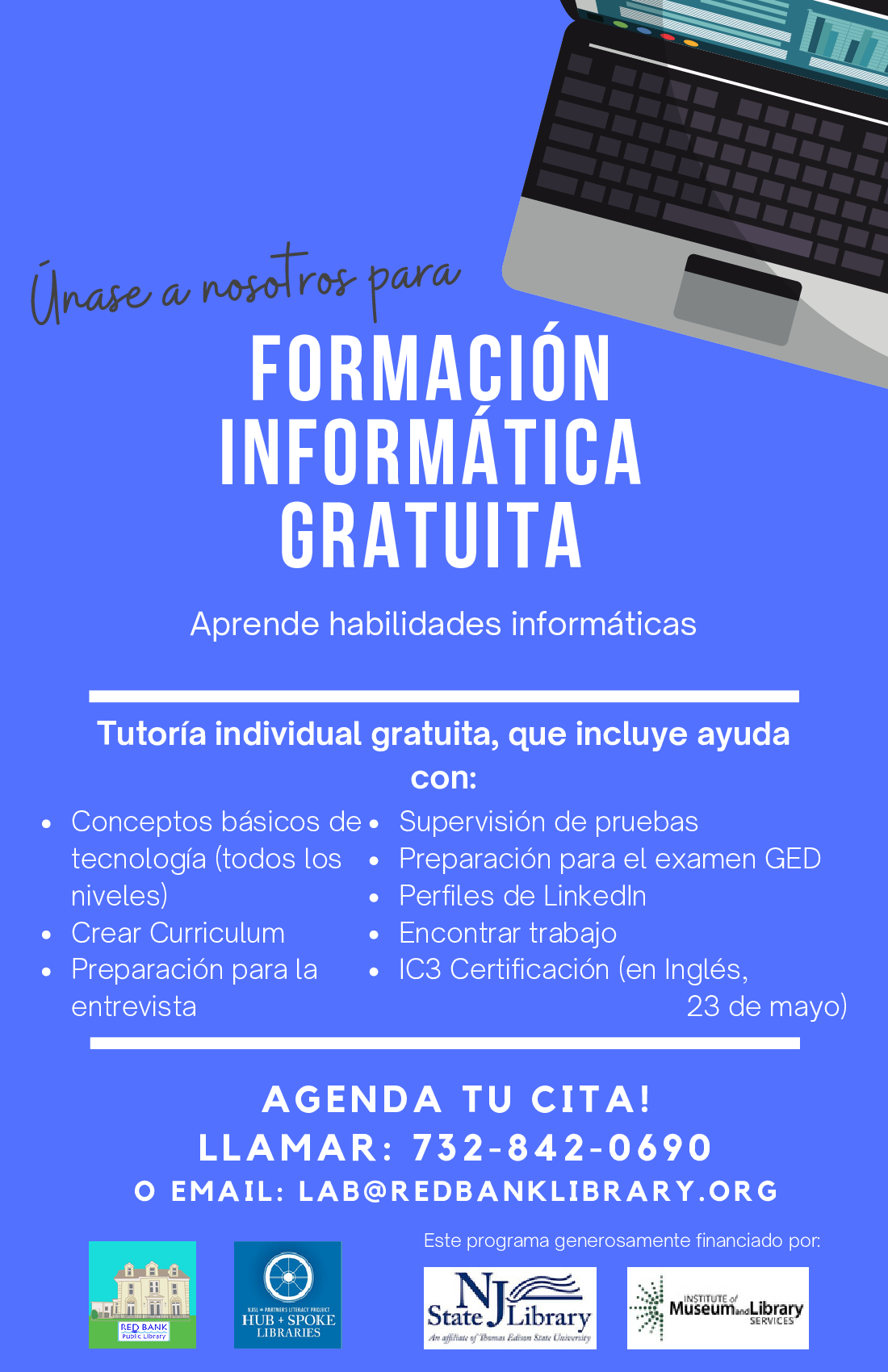 Todo esto, a excepción de la IC3 clase, se ofrece en español e inglés. El laboratorio está abierto a todos, independientemente de si tiene una tarjeta de biblioteca de Red Bank.